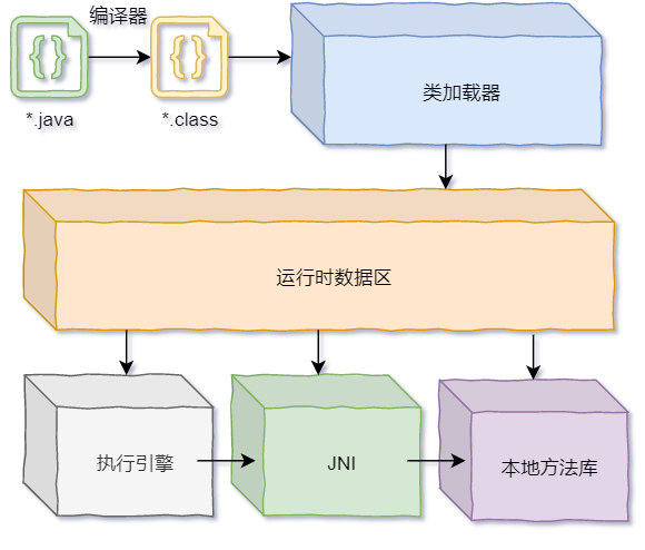 3)运行时数据区的数据通过执行引擎调用执行,或直接调用JNI执行。