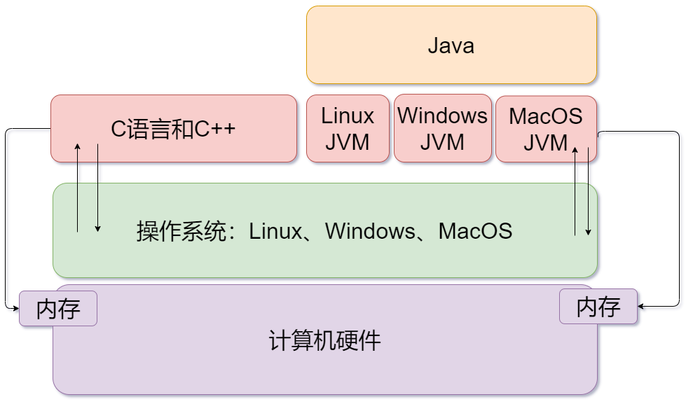 我(Java)是跨平台的,位于系统层次的最顶端,通过虚拟机JVM与操作系统或者硬件(JNI)互动。