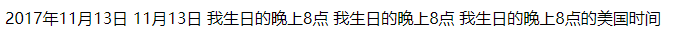 1 <time datetime="2017-11-13">2017年11月13日</time> 2 <time datetime="2017-11-13">11月13日</time> 3 <!-- datetime 属性中日期与时间之间要用“ T ”文字分隔,“ T ”表示时间 --> 4 <time datetime="2017-11-13T20:00">我生日的晚上8点</time> 5 <time datetime="2017-11-13T20:00Z">我生日的晚上8点</time> 6 <time datetime="2017-11-13T20:00+09:00">我生日的晚上8点的美国时间</time>