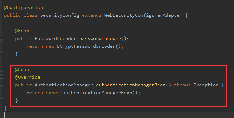 为了可以我们调用认证方法,我们重写authenticationManagerBean()方法,并且放入容器;