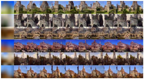当我们训练一个系统时,另外一个系统也要相应的变的更好。在实验中这的确有效,不过步长必须保持十分小,以便于系统D可以更上G的速度。下面是“Deep Generative Image Models using a Laplacian Pyramid of Adversarial Networks”中的一些例子——这个模型的一个更高级版本,它试图生成教堂的图片。