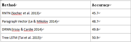 然而,最近越来越多的使用语法解析树的工作成果改变了那一结果。Irsoy和Cardie(NIPS,2014)在多维度上使用更深层的网络成功地打败了Paragraph向量。最后,Tai等人(ACL,2015)将LSTM网络与语法解析树结合,进一步改进了结果。