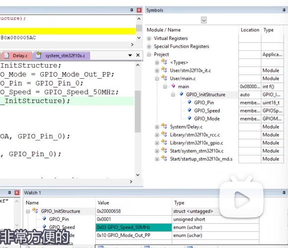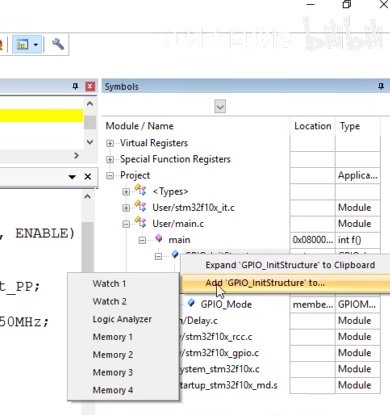 如果想看一下结构体的变化,可以在这里右键添加到watch 1窗口,单步运行,也可以看到这个值的变化。
