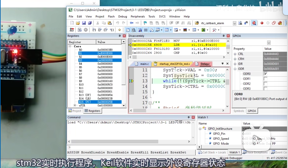 (5)主窗口是我们C语言程序,上面的窗口就是C语言翻译成的汇编程序,然后左边这个窗口是寄存器组和状态标志位等信息(这个是单片机硬件底层很重要的东西)