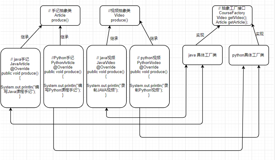 ConcreteProduce:具体产品角色,如JavaVideo、JavaArticle、PythonVideo和PythonArticle类,它定义具体工厂生产的具体产品对象,实现抽象产品接口中声明的业务方法。
