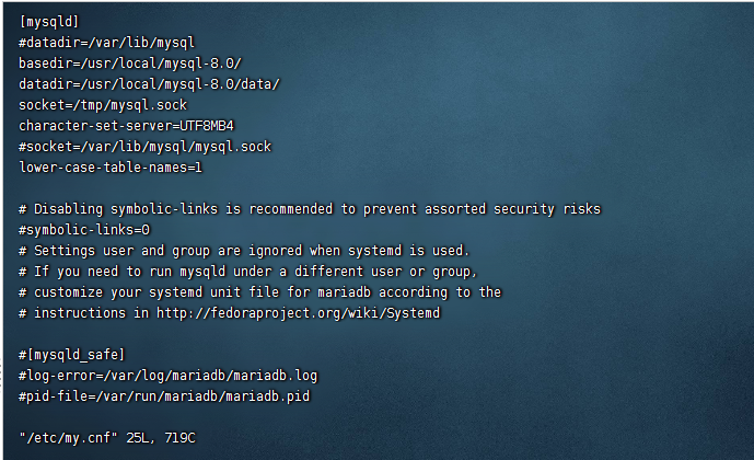 8.编辑my.cnf文件 vi /etc/my.cnf 注释mysqld_safe,加上不区分大小写lower_case_table_names=1
