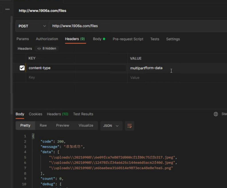 // 多文件上传 public function uploads() { //接受参数 $data = []; $files = \request()->file('imgs'); foreach ($files as $file) { // 移动到框架应用根目录/public/uploads/ 目录下 $info = $file->move(ROOT_PATH . 'public' . DS . 'uploads'); if ($info) { // 成功上传后 获取上传信息 // 输出 42a79759f284b767dfcb2a0197904287.jpg $path = DS . 'uploads' . DS . $info->getFilename(); $data[] = $path; } else { // 上传失败获取错误信息 return json(['code' => 500, 'message' => $file->getError(), 'data' => '']); } } return json(['code' => 200, 'message' => 'success', 'data' => $data]); }