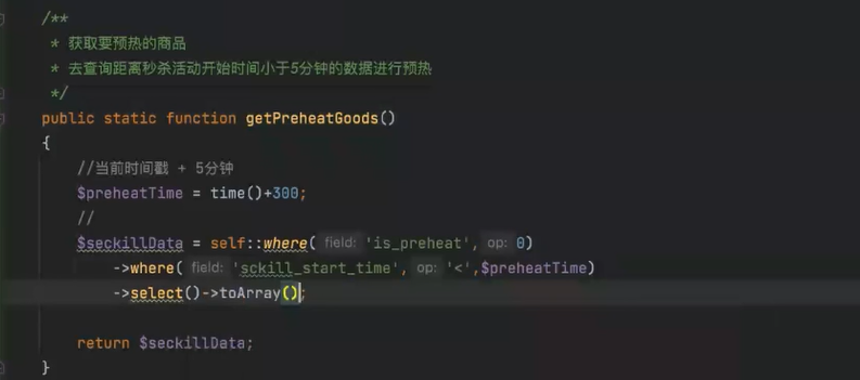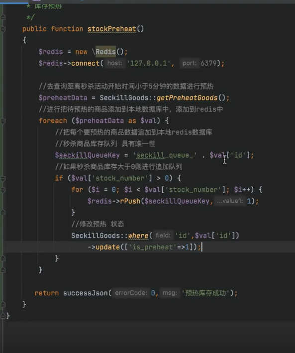 public function start() { $last = time(); $task = [6 => $last, 10 => $last, 30 => $last, 60 => $last, 180 => $last, 300 => $last]; $this->timer = \Workerman\Lib\Timer::add($this->interval, function () use (&$task) { //每隔60秒执行一次 try { //执行库存预热 $this->stockPreheat(); $now = time(); foreach ($task as $sec => $time) { if ($now - $time >= $sec) { //每隔$sec秒执行一次 $task[$sec] = $now; } } } catch (\Throwable $e) { } }); } /** * 库存预热 */ public function stockPreheat() { $redis = new \Redis(); $redis->connect('127.0.0.1', 6379); //去查询距离秒杀活动开始时间小于5分钟的数据进行预热 $preheatData = SeckillGoods::getPreheatGoods(); //进行把待预热的商品添加到本地数据库中,添加到redis中 foreach ($preheatData as $val) { //把每个要预热的商品数据追加到本地redis数据库 //秒杀商品库存队列 具有唯一性 $seckillQueueKey = 'seckill_queue_' . $val['id']; //如果秒杀商品库存大于0则进行追加队列 if ($val['stock_number'] > 0) { for ($i = 0; $i < $val['stock_number']; $i++) { $redis->rPush($seckillQueueKey,1); } //修改预热 状态 SeckillGoods::where('id',$val['id']) ->update(['is_preheat'=>1]); } } return successJson(0,'预热库存成功'); }