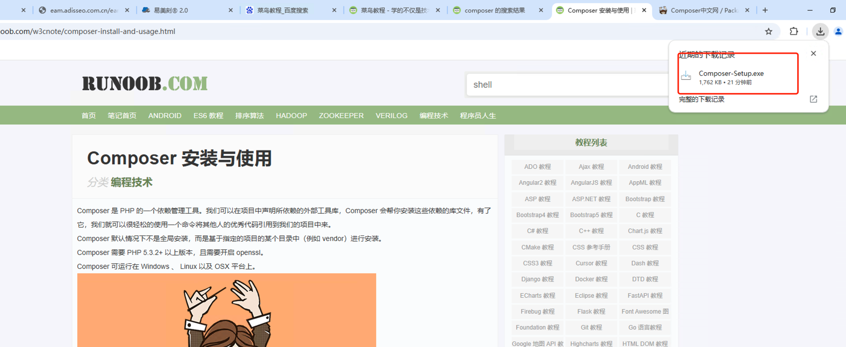 1:先去菜鸟教程安装composer 文件到widows某一个目录