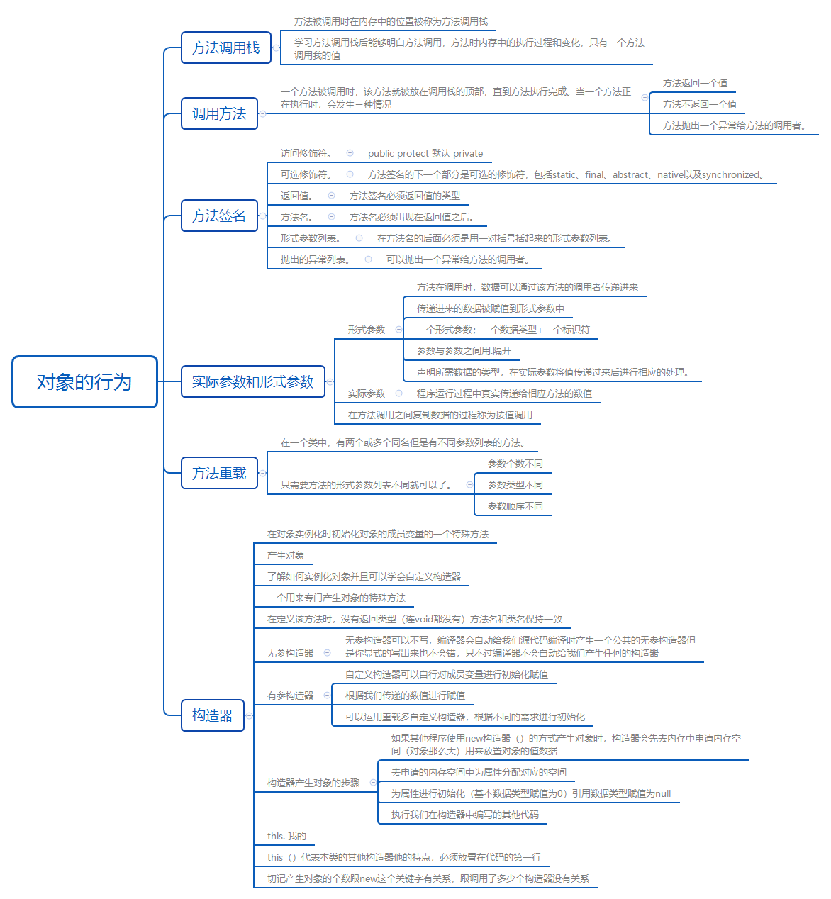 对象的行为:方法调用栈、方法被调用时在内存中的位置被称为方法调用栈、学习了方法调用栈后能够明白方法调用方法时内存中的执行过程及变化,使我们对方法有进一步的了解、当方法被调用时,其位于方法栈顶端。调用方法:调用方法就是使用方法、当一个方法正在执行时,可能会发生三件事:1方法返回一个值、2方法不返回一个值、3方法抛出一个异常给方法的调用者.控制流程都会跳转给方法的调用者。方法标签:方法标签中包括:方法名、参数列表、返回值的数据类型等。通过方法标签我们可以了解到调用一个方法时所需知道的一切。访问修饰符和可选修饰符的次序是随意的、Java中可以从方法的返回中返回任何类型的数据。方法在调用时,数据可以通过该方法的调用者传递进来、传递进来的数据被赋值到形式参数中、一个形式参数由:一个数据类型+一个标识符、参数与参数之间由,隔开。形式参数:一个方法中包含一个形式参数的列表用于声明传递到方法中的数据的类型。实际参数:调用方法时传递给方法中形式参数的数据称为实际参数、用于传递给方法具体的数值、在方法调用之间复制数据的过程称为按值调用、传递的不是对象本身,而是对象的引用。方法重载:在一个类中,有两个或多个同名但是有不同参数列表的方法。只需要方法的形式参数列表不同就可以了。参数个数不同、参数类型不同、参数顺序不同。构造器:在对象实例化时,初始化对象的成员变量的一个特殊方法。了解构造器的原理,从而了解如何实例化对象并且可以学会自定义构造器。当对象使用new关键字实例化时,JVM为对象分配内存,并初始化,以保证对象的数据有意义。默认构造器:最常用的构造器、每一个类都会拥有一个默认的构造器,方便用户进行对象的初始化、规则:1构造器的名称与类名相同、2没有返回值、3默认构造器不包含任何语句、4默认构造器中没有任何的参数,也不做任何事情。如果我们自己定义了一个构造器,编译器将不会添加默认构造器。自定义构造器:利用重载的思想进行自定义构造器定义。用处:自定义构造器可以自行对成员变量进行初始化赋值。根据我们传递的数值进行赋值。可以运用重载多自定义构造器,根据不同的需求进行初始化。构造器的结构与方法不同:构造器的成名必须与类型相同。构造器不能声明返回值,也不能返回void。构造器分为有参构造和无参构造。构造器的使用:1构造器初始化时需搭配new关键字一起使用、2当一个对象使用关键字new实例化时,构造器就被调用了、3调用后进行相应的初始化、在构造器中,可以使用关键字this来调用其它的构造器。在构造器中使用this关键字有所不同:this必须放在最前面、构造器中this代表使用构造器