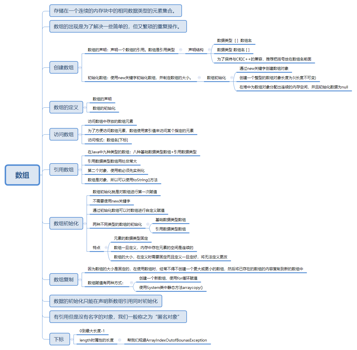 数组存储在一个连续的内存块中的相同数据类型的元素集合,数组的出现是为了解一些简单的但又繁琐的重复操作,创建对象:数据的声明,数据中间放的元素的数据内存。使用new关键字初始化数组,数组的初始化数据的大小。声明结构,声明一个引用的数据,数据类型[]数组名 数据类型 数组名[]数组的初始化:通过new关键字创建数组对象。创建一个整型的数据对象长度为3(长度不可变)。在堆中数组对象分配出连续的内存空间并且初始化为null。数组的定义=数组的声明+数组的初始化。使用,以及元素的获取都是采用下标的方式来完成的,元素为引用类型的数组声明方式跟元素为基本数据类型一致。特点1元素的数据类型固定2数组一旦定义内存中存放元素的空间是连续的3数组的大小,在定义是就需要确定,而且定义一旦确认将无法定义更改,下标数组的下标取值范围0到数组的长度-1,length是数组的长度,作用帮我们规避ArrayIndexOutofBounasException.相同的对象对应的Hash一定一样但是同样的hash值不一定一样 有引用但是没有名字的对象,我们一般称之为“匿名对象”