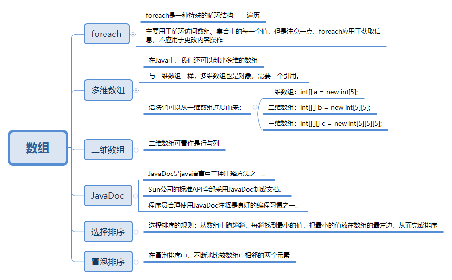 foreach是一种特殊的循环结构——遍历,主要用于循环访问数组、集合(后面讲解)中的每一个值,但是注意一点,foreach应用于获取信息,不应用于更改内容操作;。还有多维数组:在Java中,我们还可以创建多维的数组、与一维数组一样,多维数组也是对象,需要一个引用。二维数组可看作是行与列。JavaDoc是Java语言中三种注释方法之一、Sun公司的标准API全部采用JavaDoc制成文档。程序员合理使用JavaDoc注释是良好的编程习惯之一。选择排序的规则,从数组中跑趟趟,每趟找到最小的值,把最小的值放在数组的最左边,从而完成排序。冒牌排序,在冒泡排序中,不断地比较数组中相邻地两个元素