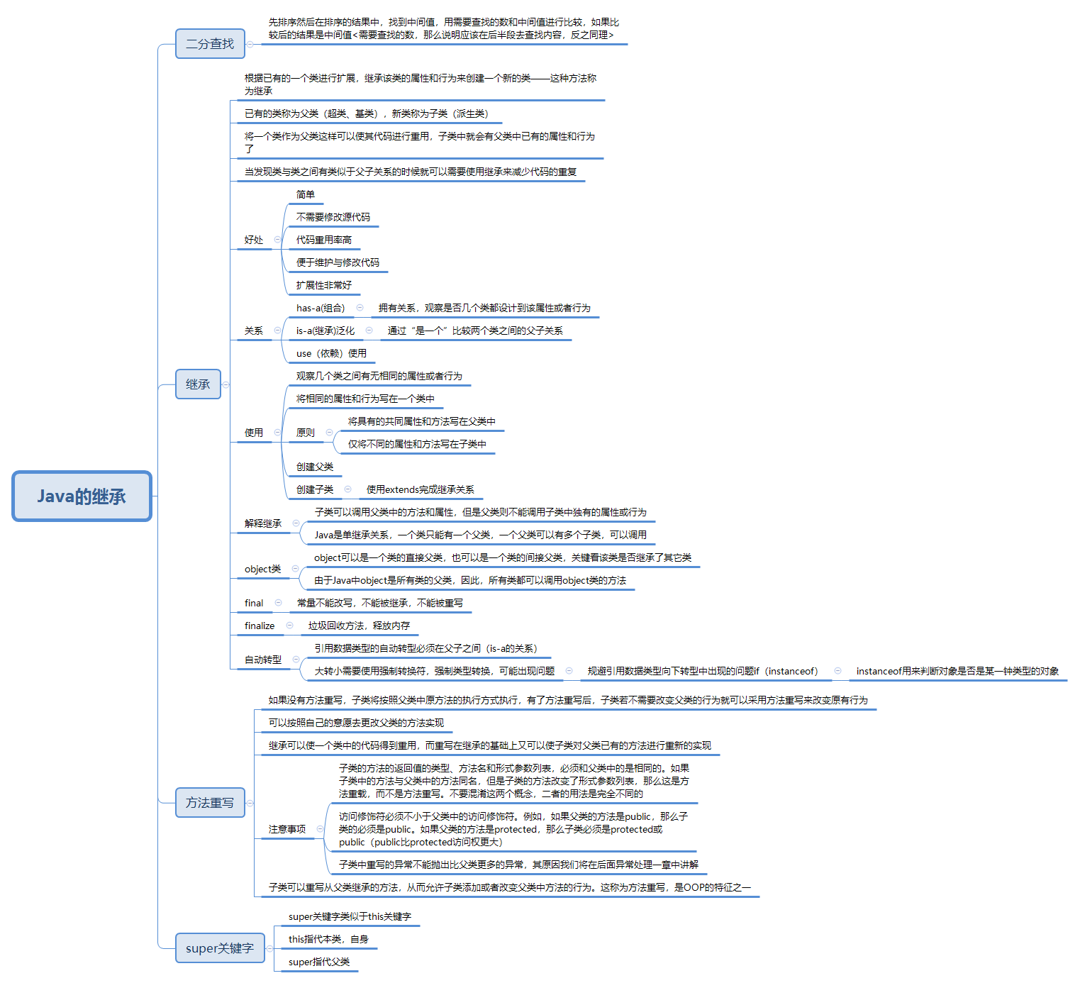 二分查找的思路、先排序然后在排序的结果中,找到中间值,用需要查找的数和中间值进行比较,如果比较后的结果是中间值<需要查找的数,那么说明应该在后半段去查找内容,反之同理>、然后学习了继承、根据已有的一个类进行扩展,继承该类的属性和行为来创建一个新的类——这种方法称为继承、已有的类称为父类(超类、基类),新类称为子类(派生类)。学习继承、将一个类作为父类这样可以使其代码进行重用,子类中就会有父类中已有的属性和行为了。还有它的好处1、较简单2、不需要修改源代码3、代码重用率高4、便于维护与修改代码。使用继承1、观察几个类之间有无相同的属性或者行为2、将相同的属性和行为写在一个类中。类与类之间的关系、has-a(组合)拥有关系,观察是否几个类都设计到该属性或者行为部分和整体的关系耦合度非常搞,聚合部分和整体的关系,耦合度比较低。is-a(继承)通过“是一个”比较两个类之间的父子关系。(泛化)use(依赖)使用。继承的使用,观察几个类之间有无相同的属性或者行为、将相同的属性和行为写在一个类中、原则1、将具有的共同属性和方法写在父类中2、仅将不同的属性和方法写在子类中。创建父类、创建子类使用extends完成继承关系。解释继承、object类还有自动转型、引用数据类型的自动转型必须在父子之间(is-a的关系)、大转小需要使用强制转换符,强制类型转换,可能出现问题的解决方式规避引用数据类型向下转型中出现的问题if(instanceof)。方法重写的注意事项1、子类的方法的返回值的类型、方法名和形式参数列表,必须和父类中的是相同的。如果子类中的方法与父类中的方法同名,但是子类的方法改变了形式参数列表,那么这是方法重载,而不是方法重写。不要混淆这两个概念,二者的用法是完全不同的2、访问修饰符必须不小于父类中的访问修饰符。例如,如果父类的方法是public,那么子类的必须是public。如果父类的方法是protected,那么子类必须是protected或public(public比protected访问权更大)、子类中重写的异常不能抛出比父类更多的异常,其原因我们将在后面异常处理一章中讲解。子类可以重写从父类继承的方法,从而允许子类添加或者改变父类中方法的行为。这称为方法重写,是OOP的特征之一。super关键字\super关键字类似于this关键字、this指代本类,自身、super指代父类。
