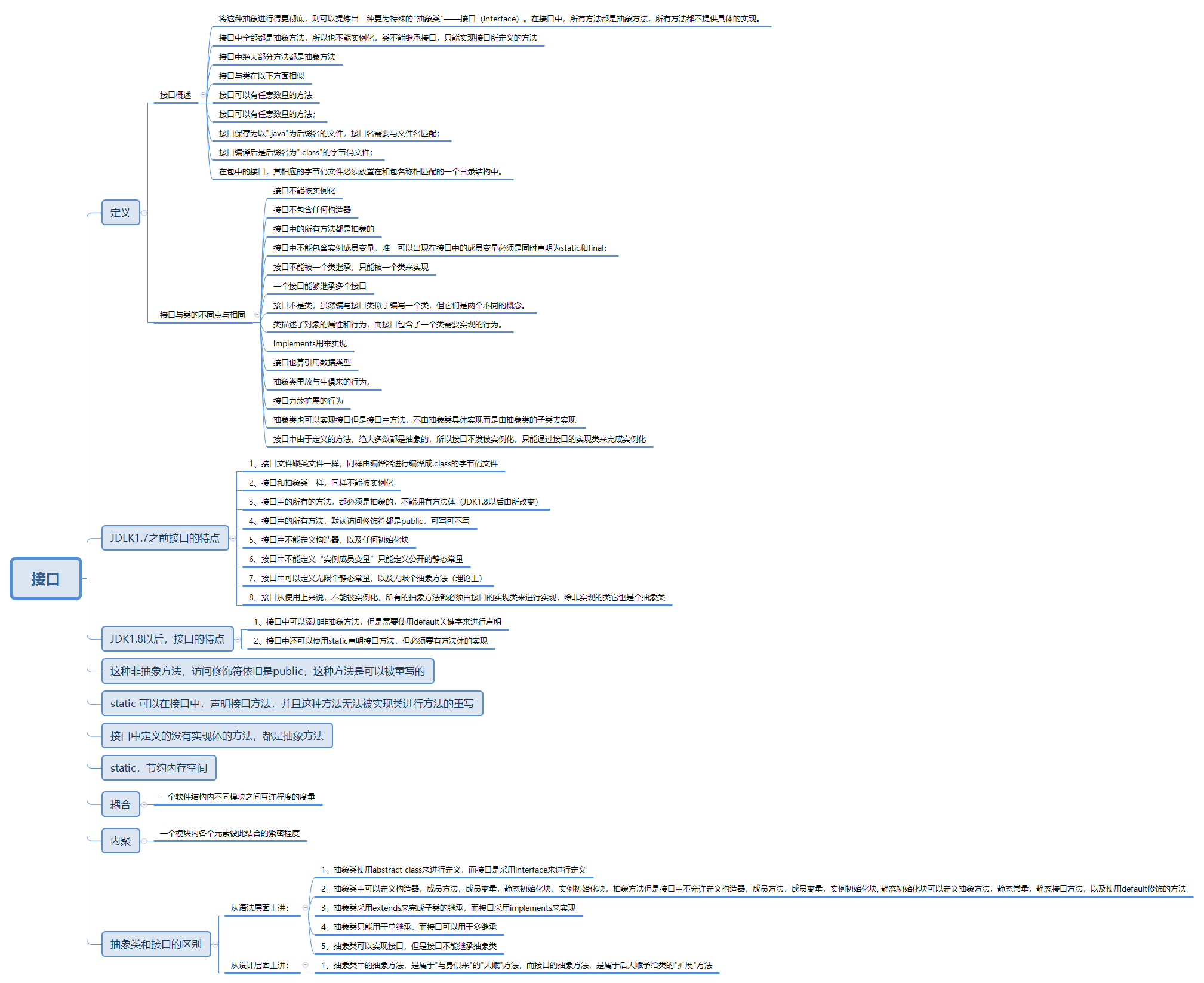接口将抽象进行得更彻底,使所有方法都是抽象方法,所有方法都不提供具体的实现一种更为特殊的"抽象类"、因为接口中全部都是抽象方法,所以也不能实例化、类不能继承接口,只能"实现"接口所定义的方法,不同处:接口不能被实例化、不包含任何构造器、接口中所有的方法都是抽象类接口中不能包含实例成员变量。唯一可以出现在接口中的成员变量必须是同时声明为static和final:接口不能被一个类继承,只能被一个类来实现一个接口能够继承多个接口:编写接口使用关系implements用来实现;下列:接口默认是抽象的。在声明接口时,不需要使用关键字abstract、接口中的每一个方法默认也是抽象的,所以也不需要关键字abstract、接口中的方法默认访问级别是public。 在编写接口的时候通常用public关键字,但是如果我们不显式地将接口中的方法声明为public,它仍然将是public的。