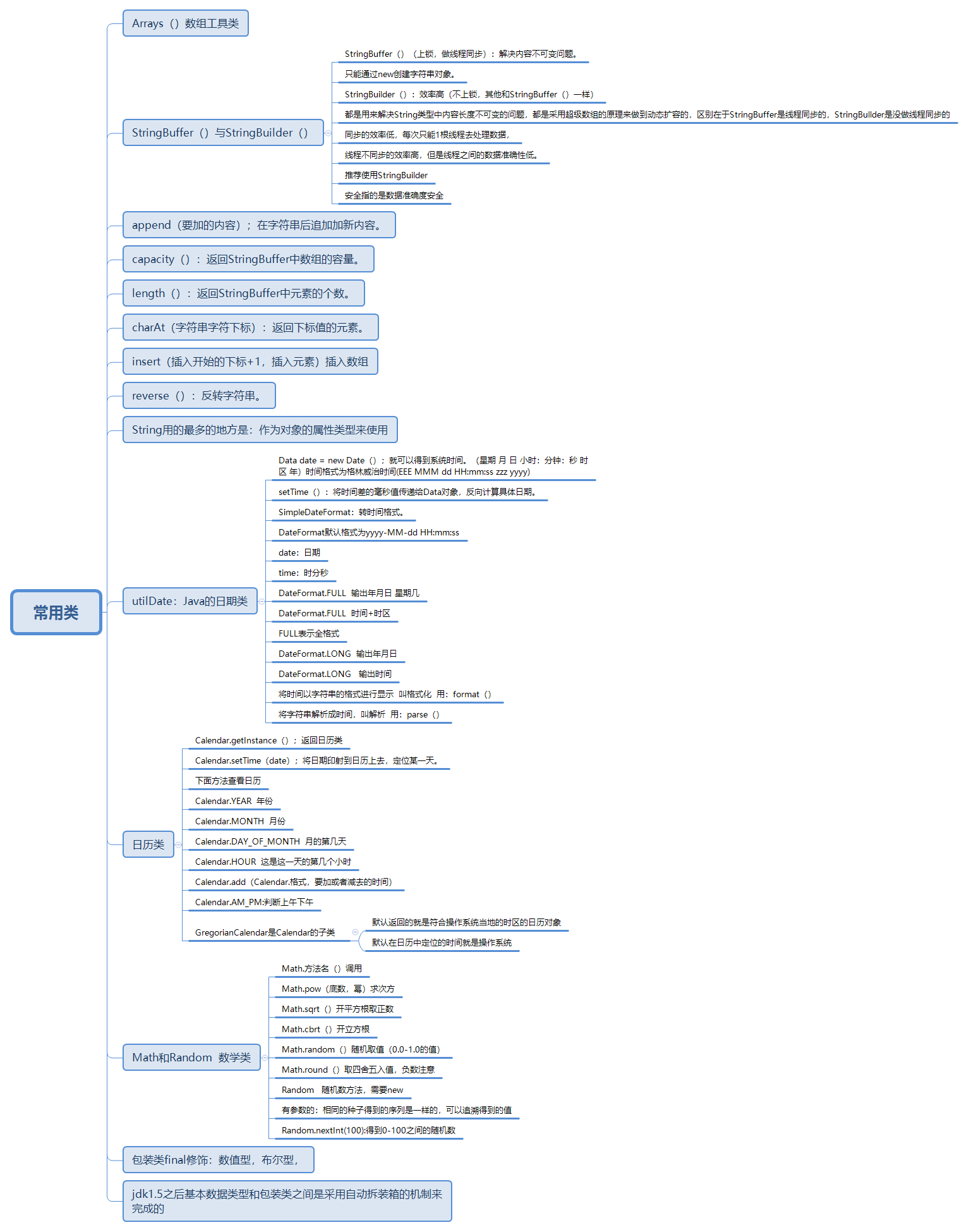 常用类需要运用api,Date、抽象类Calendar及其具体子类GregorianCalendar、抽象类DateFormat及其具体子类SimpleDateFormat类共同组成了标准日期时间处理类。Date类主要用于获取当前日期时间,DateFormat和SimpleDateFormat类主要用于格式化日期时间。Calendar和GregorianCalendar类主要用于对日期时间操作、Math类是一个数学工具类,其中所有方法都是静态的。Random类是Java中功能最为强大的随机数生成器。Java中提供8种包装类用于将8种基本类型封装成对象。JDK1.5后提供了自动装箱/拆箱功能