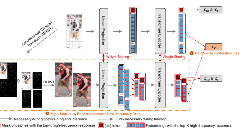 Patch-wise Contrastive Loss 是在对比同一身份的高频增强嵌入(high-frequency enhanced embeddings, 即第一部分)与原始嵌入(embeddings, 直接通过VIT进行特征提取得到的)。目标是拉近属于同一身份的嵌入,同时推开不同身份的嵌入,从而提高模型对关键高频组件(如衣物纹理)的特征表示能力,提取出更具区分度的个人表征。