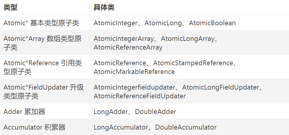底层实现:大部分底层使用了CAS锁(CompareAndSet自旋锁),如AtomicInteger、AtomicLong等;也有使用了分段锁+CAS锁的原子类,如LongAdder等。