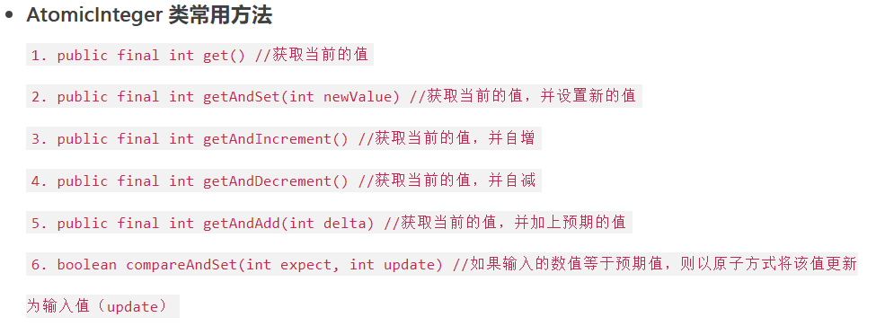 import java.util.concurrent.atomic.AtomicInteger; /** * AtomicInteger demo */ public class AtomicIntegerDemo { private static AtomicInteger sum = new AtomicInteger(0); public static void increase(){ sum.incrementAndGet();//值加一操作 } public static void main(String[] args) throws InterruptedException{ for (int i=0;i<10;i++){ new Thread(()->{ for (int j=0;j<10;j++){ increase(); System.out.println(sum); } }).start(); } } }
