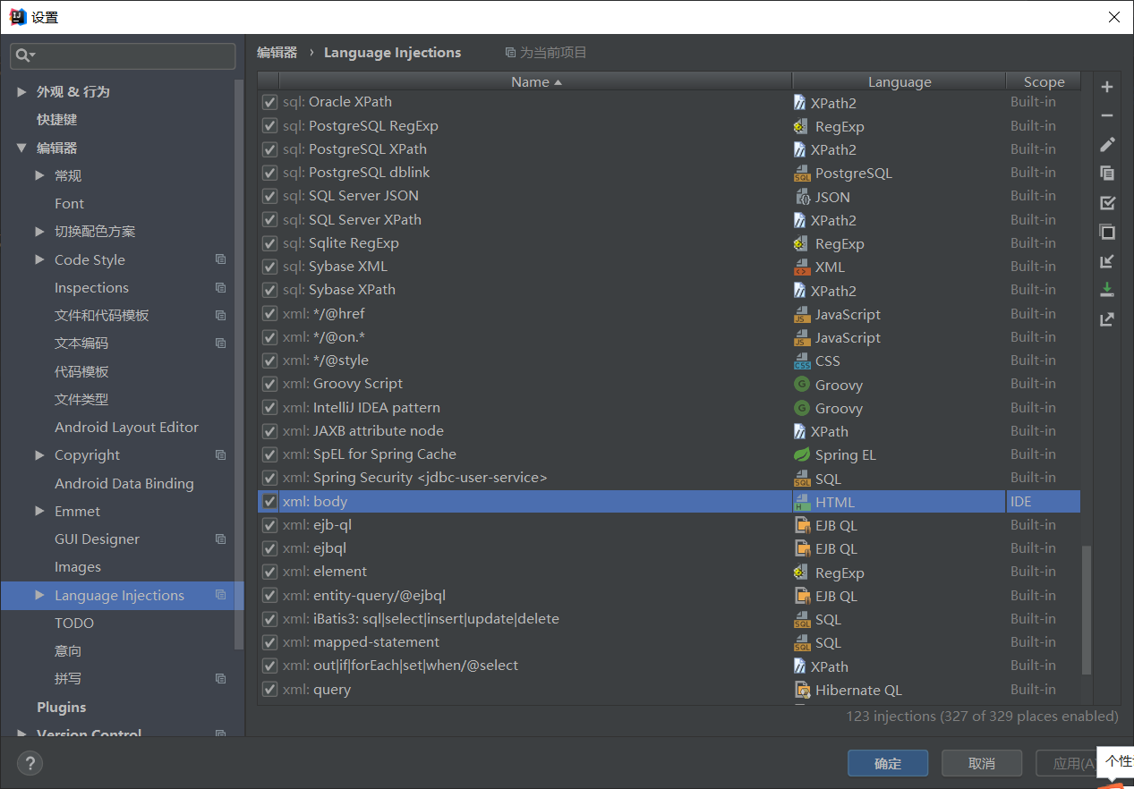 idea编辑jsp页面部分页面变黄绿色并且不提示,解决很简单,设置里边找language injection就ok