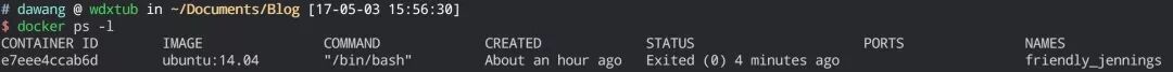 操作完成后,输入 exit 便可以退出这个 ubuntu 容器。退出之后这个容器依然存在,我们可以用 docker ps -l来看看: