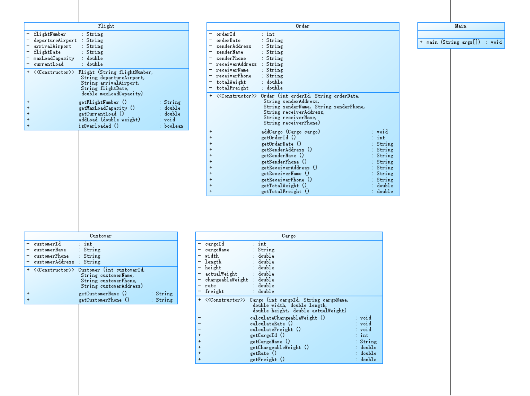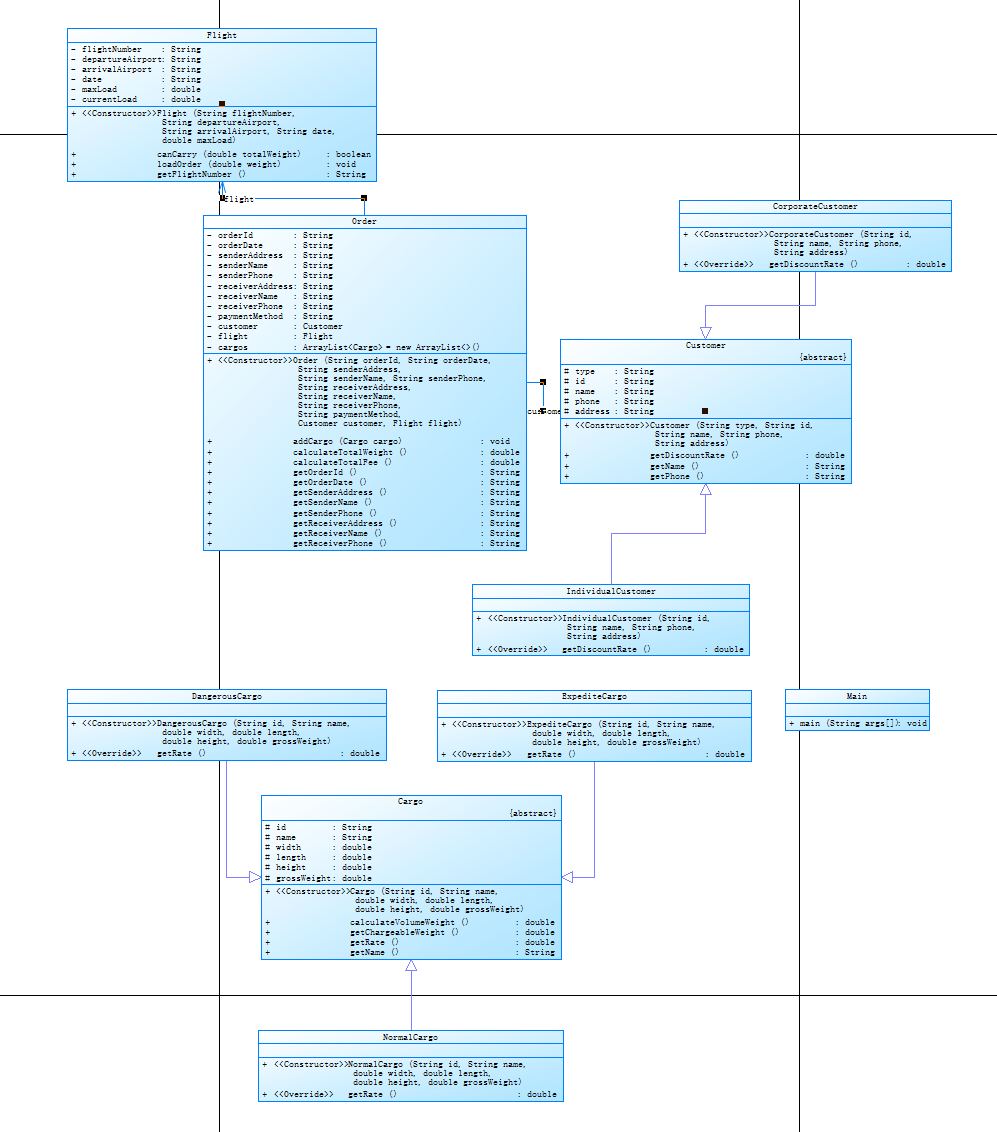 类设计与职责划分:需设计客户(Customer)、货物(Cargo)、航班(Flight)、订单(Order)等核心类,确保单一职责。
