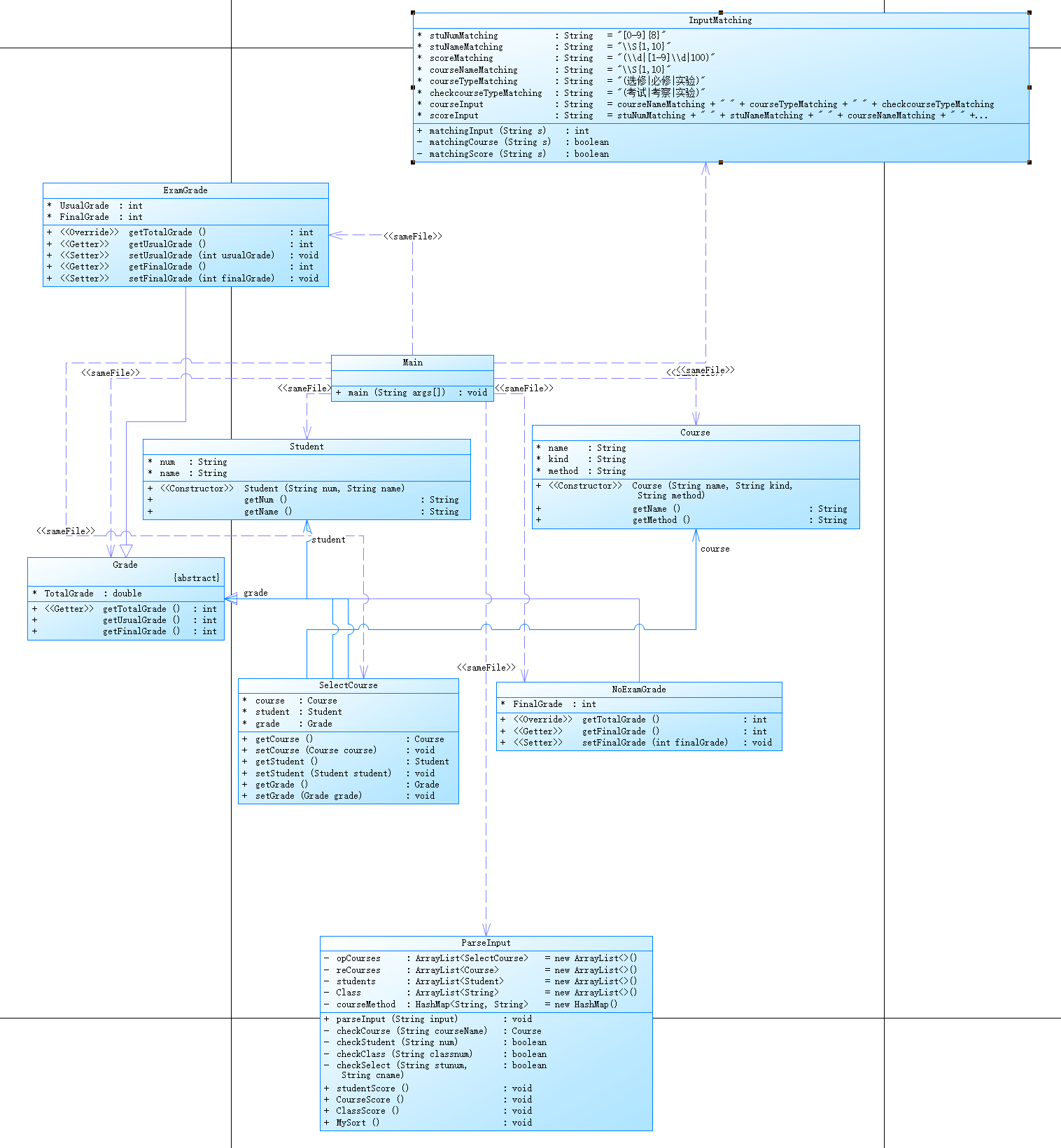 本次实验最关键的就是课程成绩统计程序,两次实验根据课程成绩统计程序-1一点一点添加功能,难度逐级递增,主要知识点还是与java类有关,其中包括了: