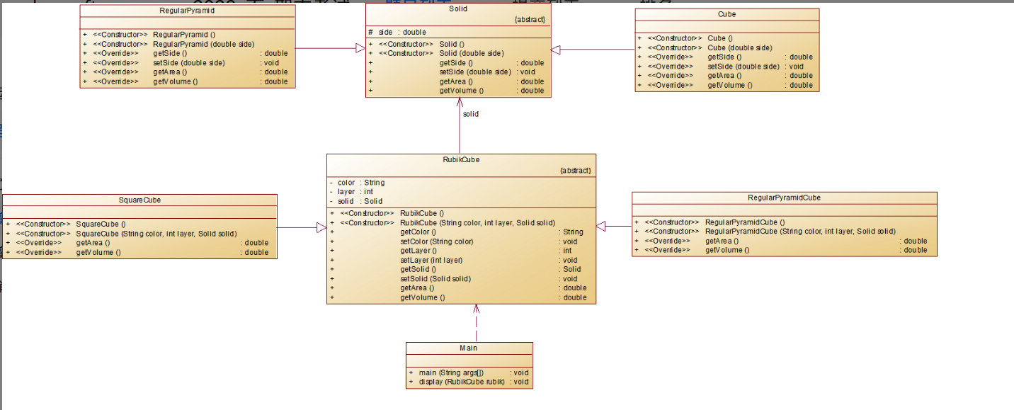 魔方有三个属性:颜色,阶数,类型(正方体魔方、正三棱锥魔方),程序要求输出魔方的颜色、表面积和体积。参考设计类图如下所示: