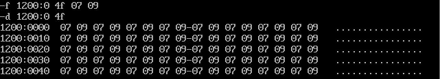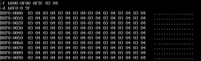 把内存单元区间b800:0f00 ~ b800:0f9f连续160个字节,依次重复填充十六进制数据03 04。