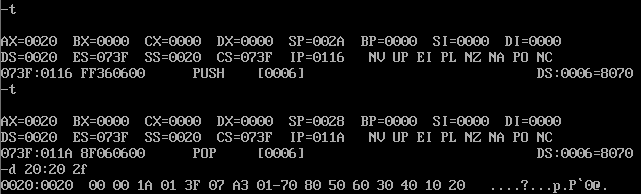 问题2:单步调试到汇编指令 push [6] 执行结束, pop [6] 执行之前,使用 d 20:20 2f 查看此 时栈空间数据,给出实验截图。