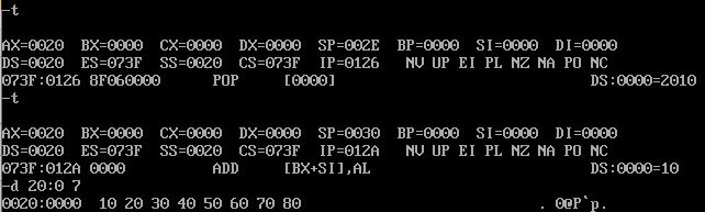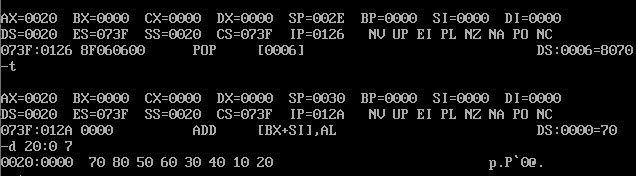 问题3:汇编指令 pop [0] 执行结束后, pop [0] 指令执行结束后,使用d命令 d 20:0 7 查看此 时数据空间内的数据是否有变化。给出实验截图。