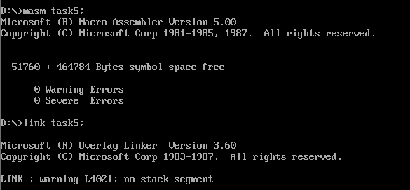 给出使用masm、link对程序汇编链接过程截图,以及,运行可执行程序task5.exe的运行结果截图