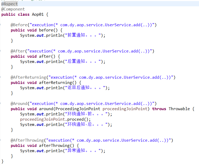 环绕通知:环绕目标方法执行,传入ProceedingJoinPoint参数,执行proceed方法,前段在前置通知后,后段在后置通知后,后段通知能被异常通知打断 @Around