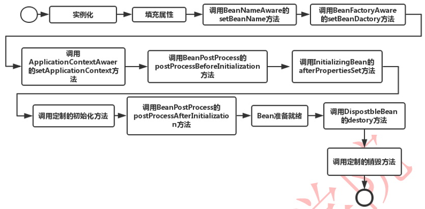 10.如果Bean实现了DispostbleBean接口,Spring将调用它的destory方法,作用与在配置文件中对Bean使用destory-method属性的作用一样,都是在Bean实例销毁前执行的方法。