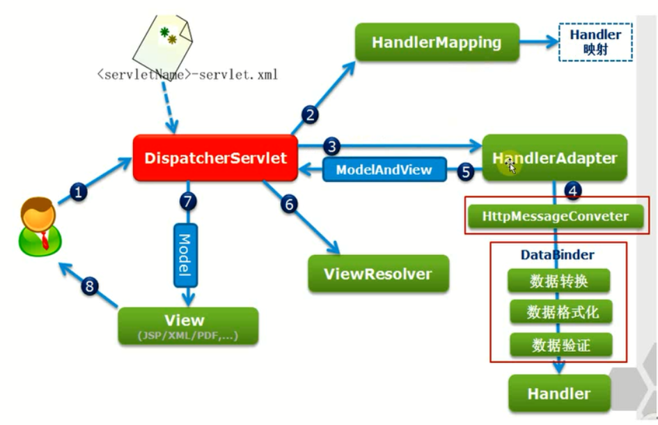 获取HandlerAdapter,可执行拦截器,调用Handler处理具体请求,返回ModelAndView