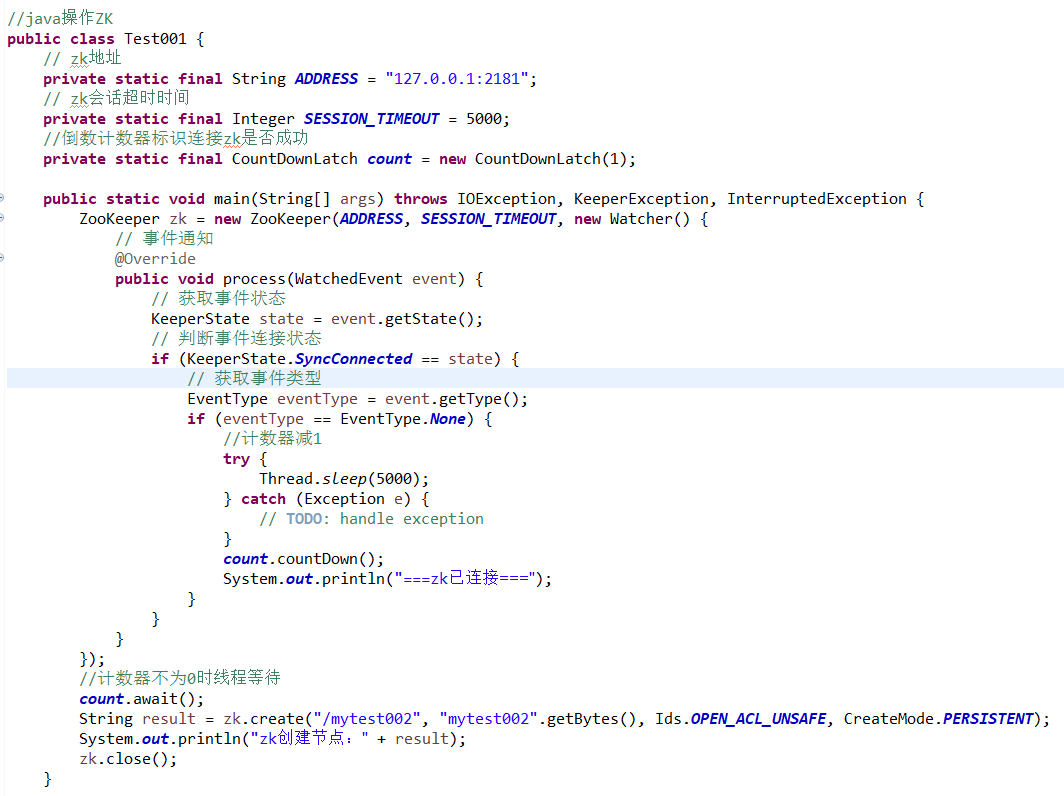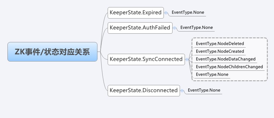 @Override public void process(WatchedEvent event) { KeeperState state = event.getState(); if (state == KeeperState.SyncConnected) { EventType type = event.getType(); if (type == EventType.None) { count.countDown(); System.out.println("zk 连接成功"); } else if (type == EventType.NodeCreated) { System.out.println("事件通知,创建节点:" + event.getPath()); } else if (type == EventType.NodeDataChanged) { System.out.println("事件通知,节点数据修改:" + event.getPath()); } }