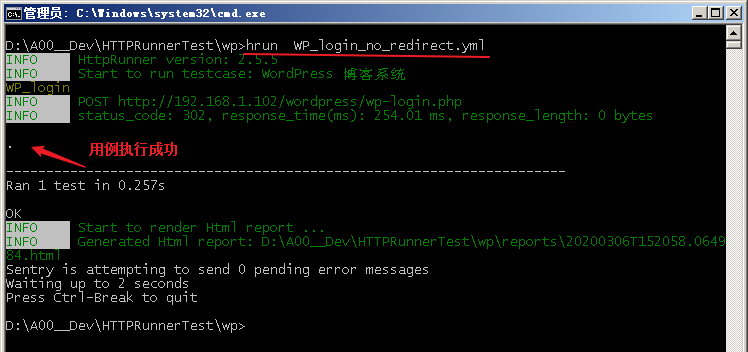 执行用例,成功。说明提取指定 cookie 的操作和 302 状态的断言都成功。