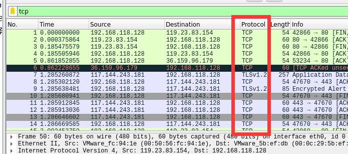 (2)Packet List Pane(数据包列表): 显示捕获的数据包,它包括了每个数据包的编号,时间戳,源地址,目标地址,协议,长度,以及数据包信息。