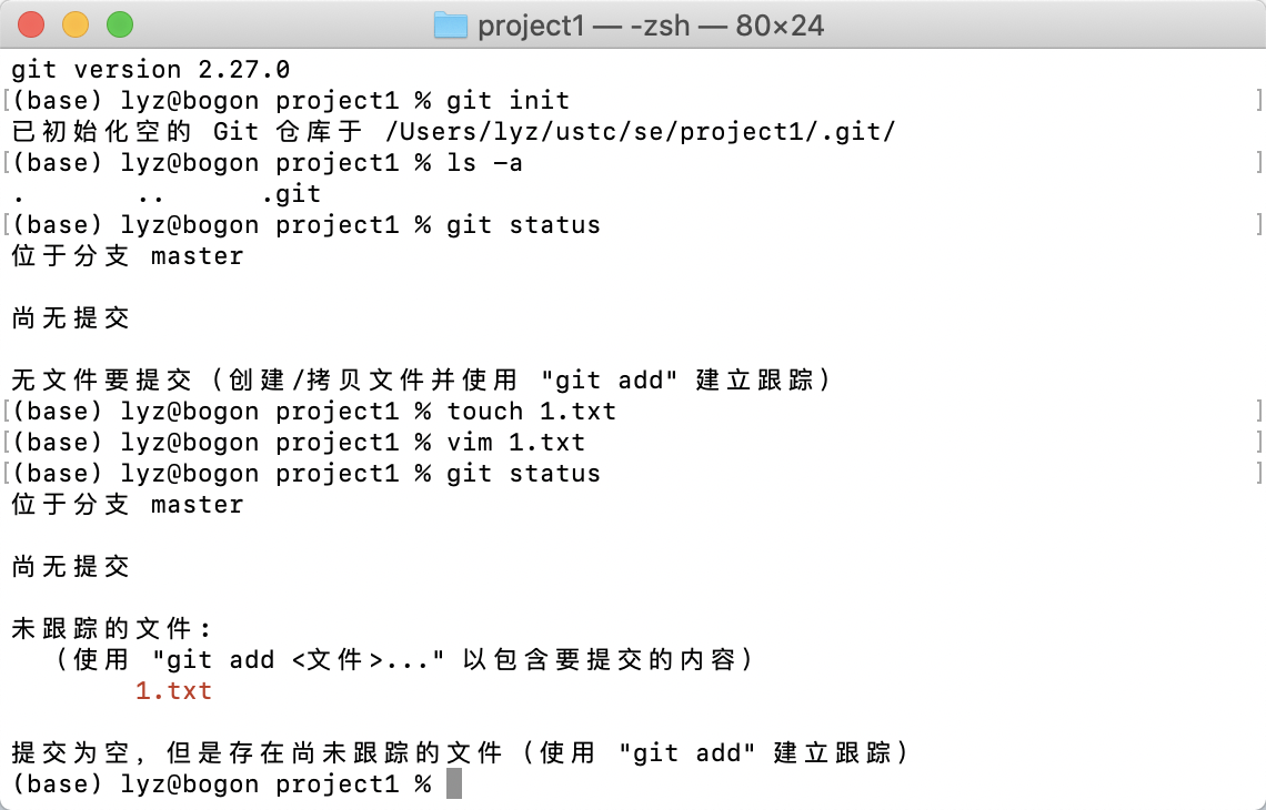 1 touch 1.txt 2 vim 1.txt 3 git status