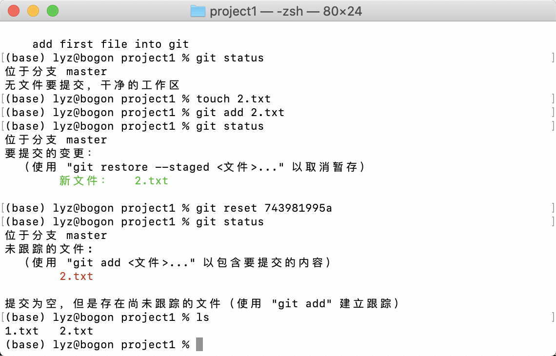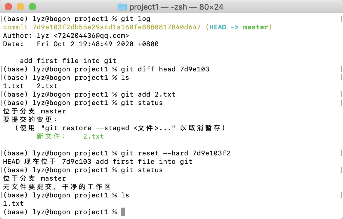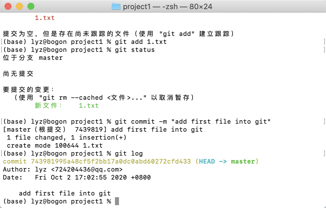 1 git add 1.txt 2 git commit -m "add first file into git"