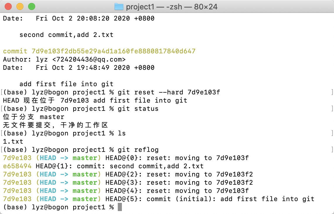有了回到过去,我们当然还可以再次反悔,回到未来。使用以下命令查看reset记录。