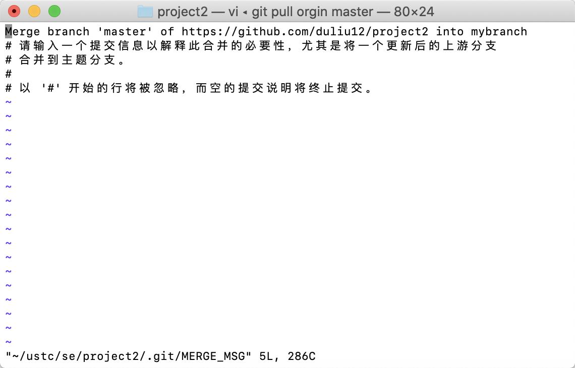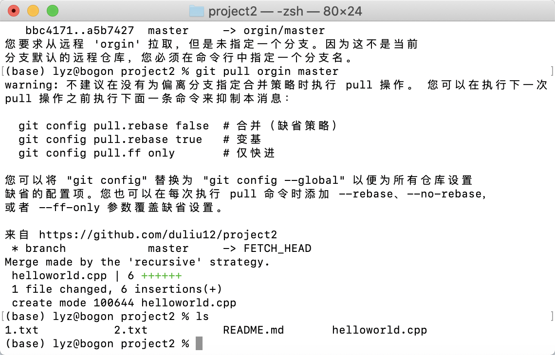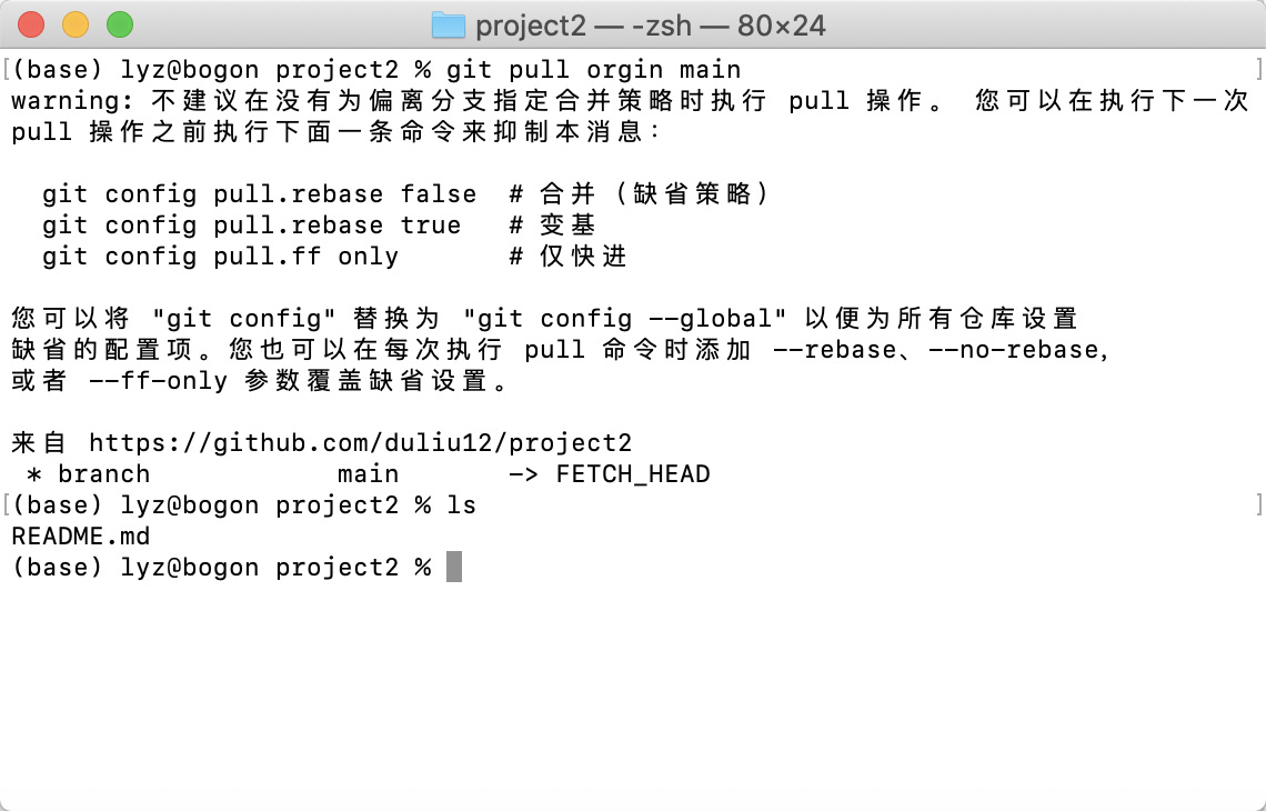 然后我们将原来的project2删除,并重新从远程仓库pull下来,运行以下命令: