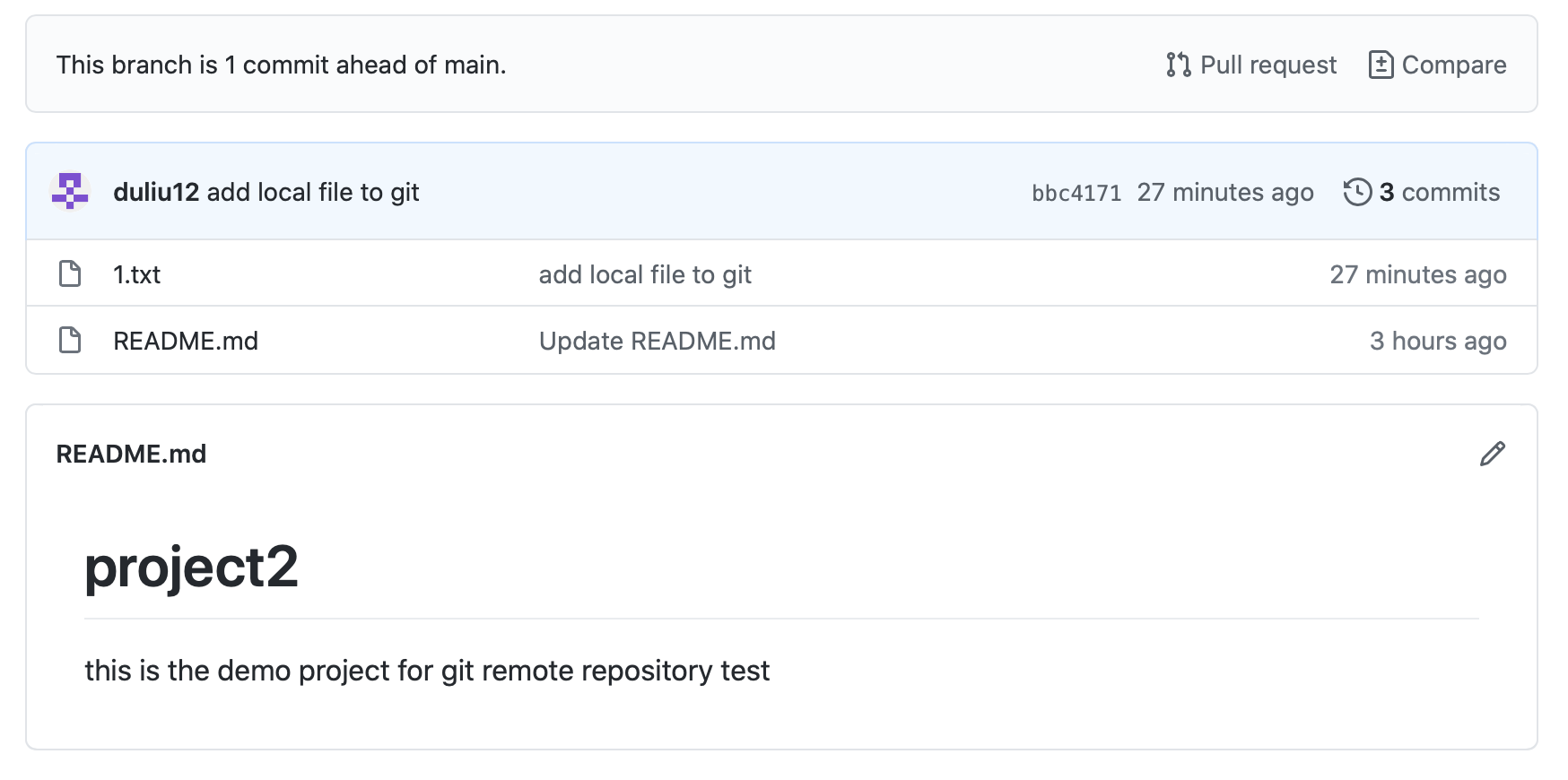 之后在本地仓库添加一个1.txt文件后push到远程仓库,使用的命令如下: