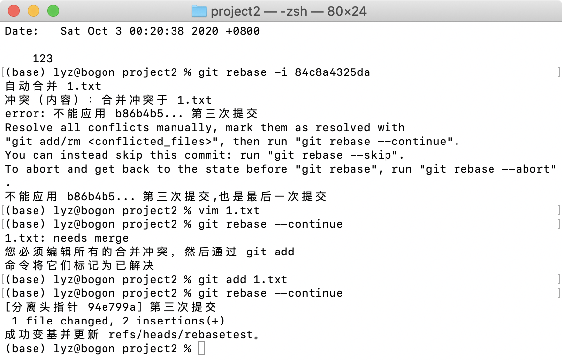 会提示有冲突,再打开1.txt解决冲突,最后使用git rebase --continue