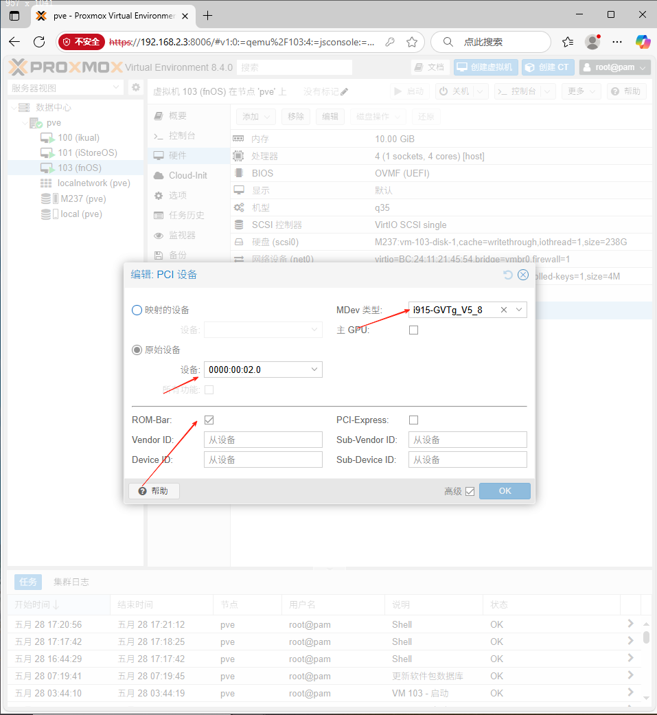 添加PCI设备:核显GVT-g(勾选ROM-Bar和PCIE在Mdev类型中选择vgpu设备i915-GVTg_V5_8) - 由于采用UEFI模式安装需要关闭Secure Boot 才能正常安装飞牛,开机时按esc键即可进虚拟机BIOS,将安全启动关闭