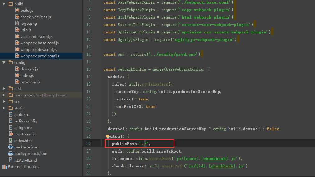 当然在config文件夹下的index.js中修改 assetsPublicPath: './'同样也可以达到资源的相对引用。