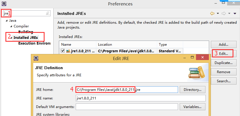6、JRE配置:JRE(java runtime environment)java运行环境,提供了丰富的类库,可以直接供我们直接调用,需要做相关设置将Eclipse的jre设置指向我们jdk下的JRE文件夹(jre内置在jdk里面)