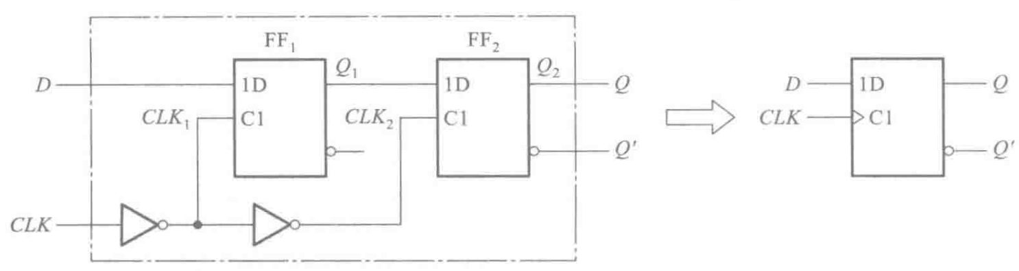 如图所示为用两个电平触发 D 触发器组成边沿触发 D 触发器的原理性框图,图中的 FF1 和 FF2 是两个电平触发的 D 触发器(也称为 D 型锁存器)。
