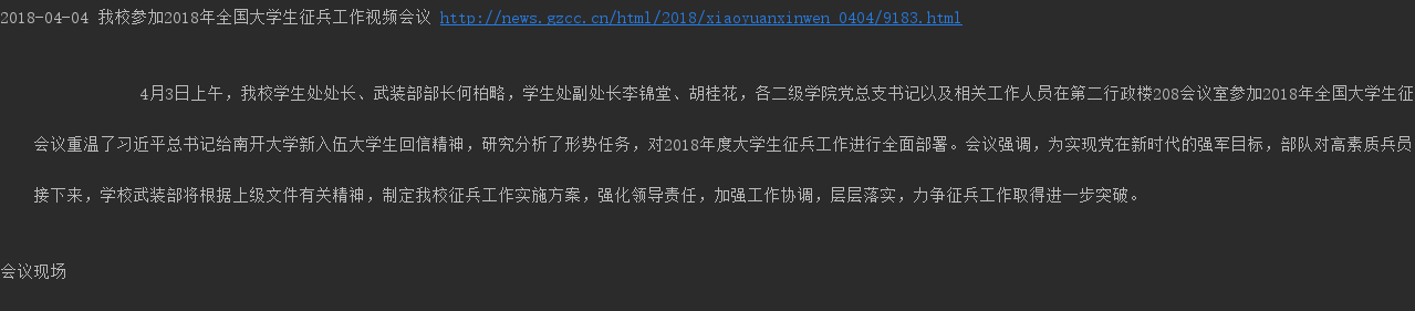 import requests from bs4 import BeautifulSoup url = 'http://news.gzcc.cn/html/xiaoyuanxinwen/' res = requests.get(url) res.encoding = 'utf-8' soup = BeautifulSoup(res.text, 'html.parser') for news in soup.select('li'): if len(news.select('.news-list-title'))>0: t = news.select('.news-list-info')[0].contents[0].text #时间 h = news.select('.news-list-title')[0].text #标题 a = news.select('a')[0].attrs['href'] #连接 print(t, h, a) # 通过连接获取新闻网页 res2 = requests.get(a) res2.encoding = 'utf-8' soup2 = BeautifulSoup(res2.text, 'html.parser') # 取得新闻正文 z=soup2.select('#content')[0].text print(z) break