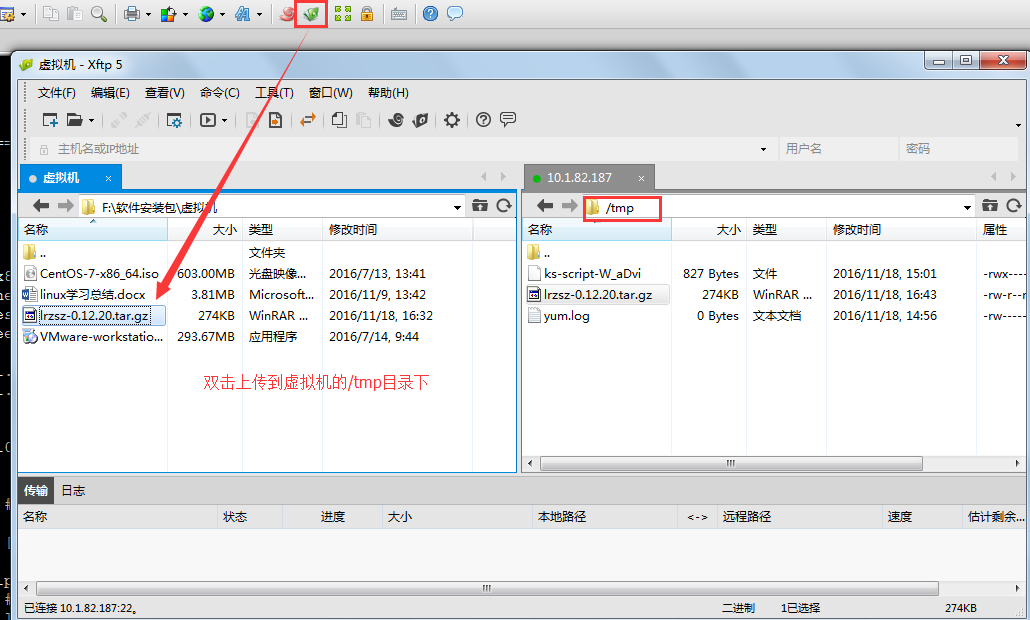 通过xftp工具把1)中下载的安装文件上传到/tmp目录下,如下图: